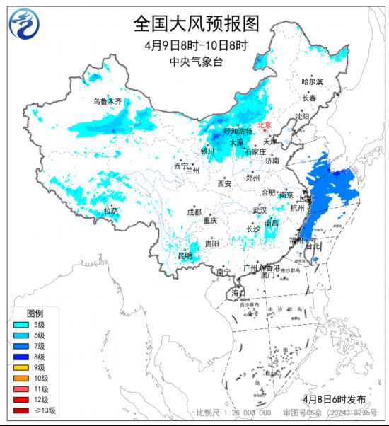 预计,4月8日8时至9日8时,新疆东部和南疆盆地、内蒙古、甘肃东部、宁夏北部、吉林中西部、辽宁北部以及西藏大部、川西高原、云南、贵州等地部分地区有5~7级风,阵风8~9级;黄海中部和南部海域、东海西北部海域有7级风,阵风8级。