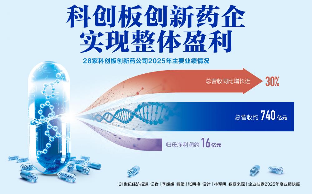 近期,28家科创板创新药公司集中披露2025年度业绩快报。数据显示,28家公司合计实现营业收入约740亿元,同比增长近30%,创历史新高;归母净利润约16亿元,成功扭转亏损局面,实现了从长期“烧钱”到整体盈利的历史性跨越。